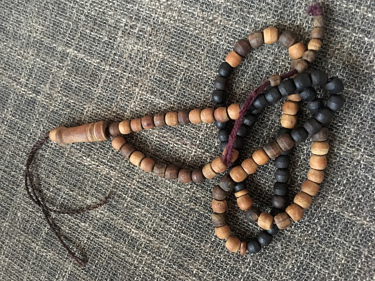 Eine islamische Gebetskette, häufig als Misbaha bezeichnet, besteht aus 99 unterschiedlichen, kleinen und großen Holzkugeln, die auf einer Stoffschnur zu einer Kette aufgereiht sind. Als Abschluss der Kette befindet sich oben ein ca. drei Zentimeter großes, hellbraunes Holzstück, auf dem eine kleine, hellbraune Kugel angebracht ist. Der obigen, hellbraunen Kugel entspringen zwei schwarze Stofffäden, an der die Kette festgehalten werden kann. Die Holzkugeln der Kette sind in unterschiedlichen braunen und schwarzen Farbtönen gefärbt.